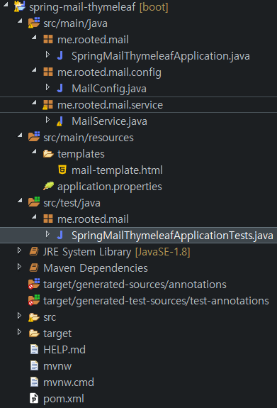 Spring Boot 2.x 기준 Mail Send Client를 간단히 소개해봅니다. 기 프로젝트에 적용하실 분들은 1-2로, 신규 프로젝트로 진행하실 분들은 1-1로 봐주시면 되겠습니다.1-1. 프로젝트 생성 1-2. Maven dependency(pom.xml) 설정 org.springframework.boot spring-boot-starter-mail org.springframework.boot spring-boot-starter-thymeleaf 2. 프로젝트 구조 3. src/main/resources/application.properties 설정## thymeleaf default settingsspring.thymeleaf.prefix=classpath:/templates/spri..